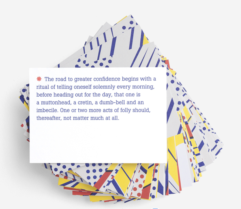 These Confidence Prompt Cards keep a variety of consoling and invigorating arguments at the front of our minds, ready for the greater and smaller challenges of our lives. They remind us, for the sake of confidence, not to think too well of others; to speak to ourselves in kinder tones; and to remember that the greatest thing we should fear isn’t messing up, but dying without having given it a go.