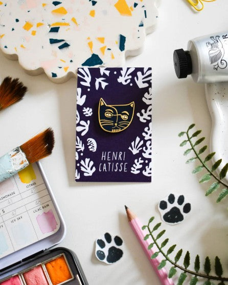 An original artist and feline inspired illustrated enamel pin badge. The ‘Cat Artist' enamel pin range is a feline reimagining of some of the greatest artists of all time. The 'Catisse' pin is a feline interpretation of fauvist legend, Henri Matisse now reimagined as 'Henri Catisse.’ Combining a love of cats and a passion for art, illustrator and designer Nia Gould (‘Niaski’) has created a punny pin range celebrating the life and times of artistic felines. Illustrated backing card Hard enamel pin badge