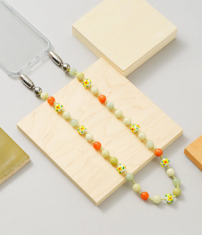 Genuine, natural gemstones and floral lamp work beads. Strung on braided cord, double knotted between each bead.