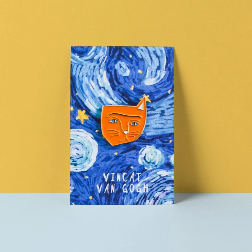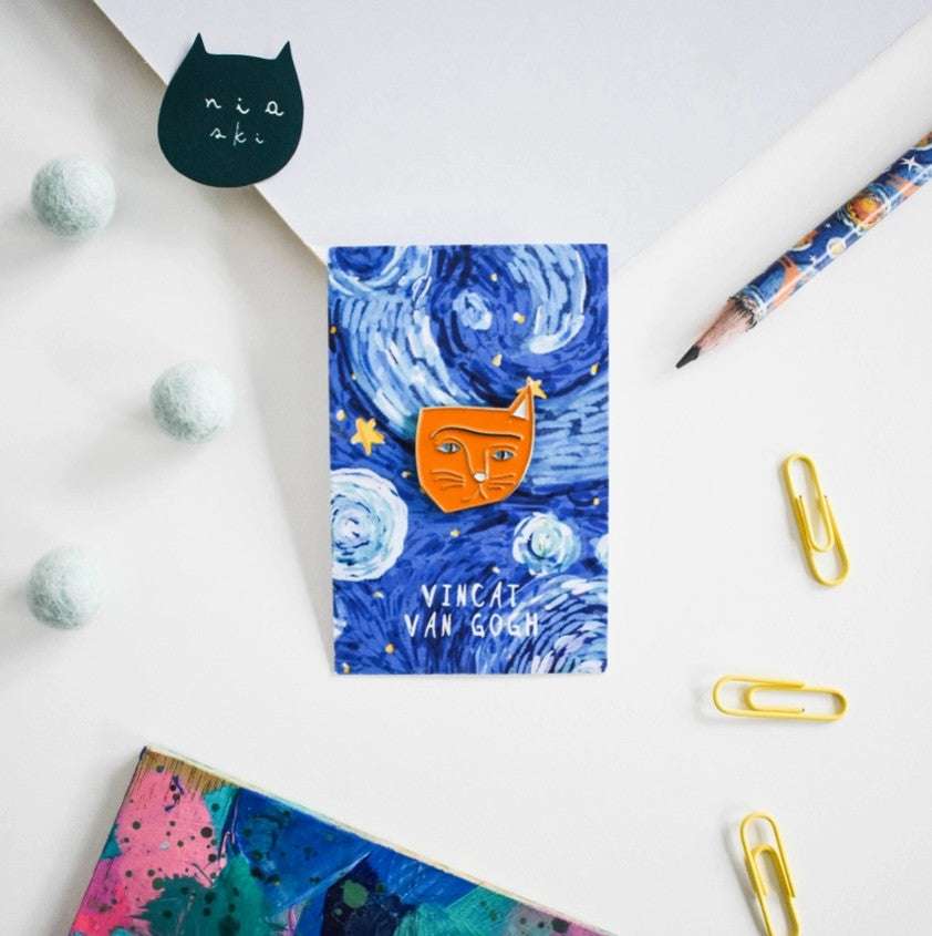 An original artist and feline inspired illustrated pin badge. The ‘Cat Artist' enamel pin range is a feline reimagining of some of the greatest artists of all time. The 'Vincat' pin is a feline interpretation of Post-Impressionist legend, Vincent Van Gogh now reimagined as 'Vincat Van Gogh’ Combining a love of cats and a passion for art, illustrator and designer Nia Gould (‘Niaski’) has created a punny pin range celebrating the life and times of artistic felines. Illustrated backing card Hard enamel pin badge