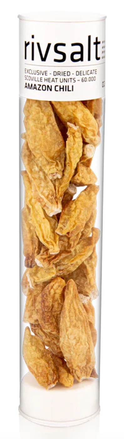 This exclusive yellow AMAZON CHILI [Capsicum Annuum] grows in Colombia and belongs to the sharper but not extreme group of chilies with 50,000-70,000 Scoville heat units. Amazon chilies are harvested just before full ripeness, that’s why they are yellow. Refine your soups, meat dishes and dips with this grated delight.