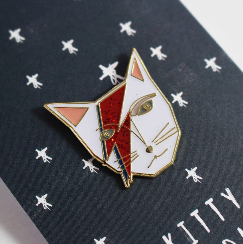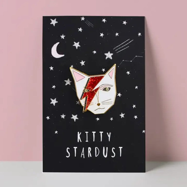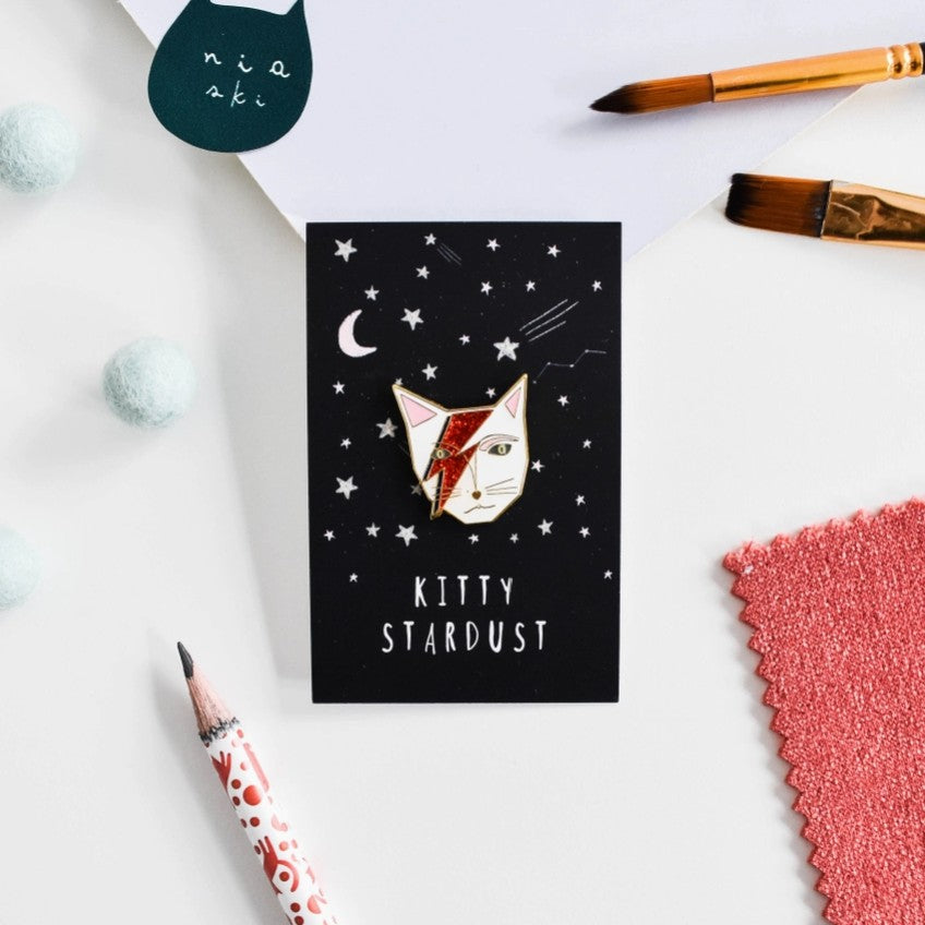 An original artist and feline inspired illustrated enamel pin badge. The ‘Cat Musician' enamel pin range is a feline reimagining of some of the greatest artists of all time. The 'Stardust' pin is a feline interpretation of music legend, David Bowie now reimagined as 'Kitty Stardust.’ Combining a love of cats and a passion for art, illustrator and designer Nia Gould (‘Niaski’) has created a punny pin range celebrating the life and times of artistic felines. Illustrated backing card Hard enamel pin badge