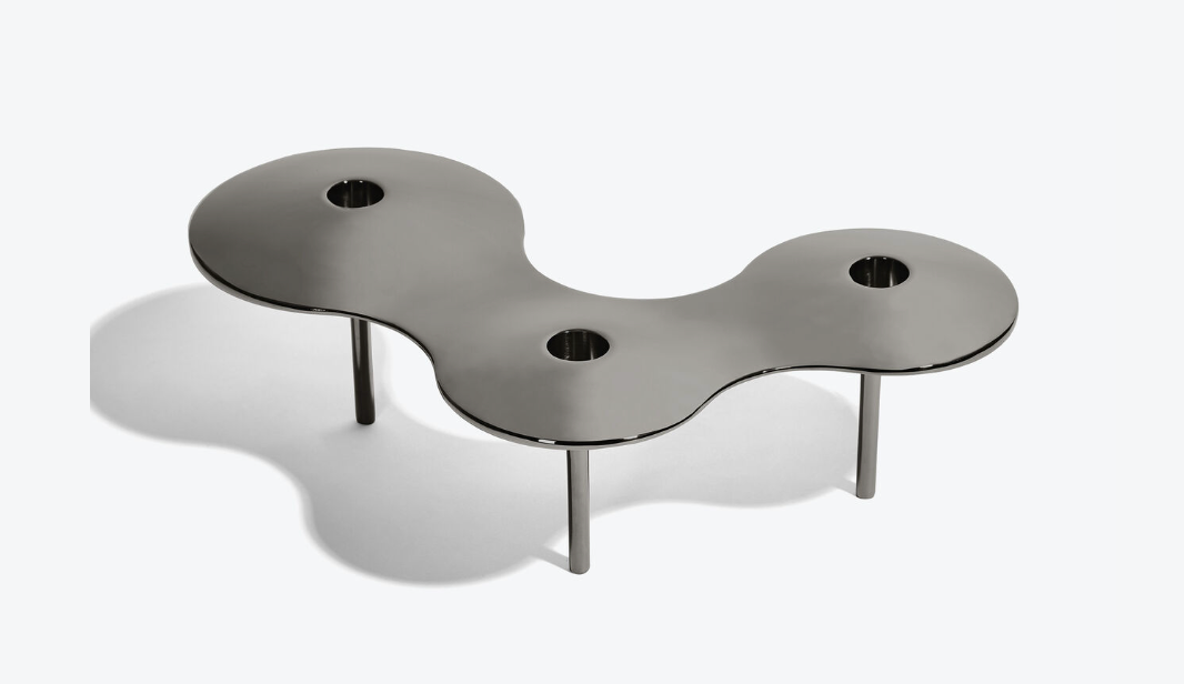CELL Candleholder - polished stainless steel - suspended by three tapered legs and designed to hold three candles - inspired by the replication and growth of cellular organisms.